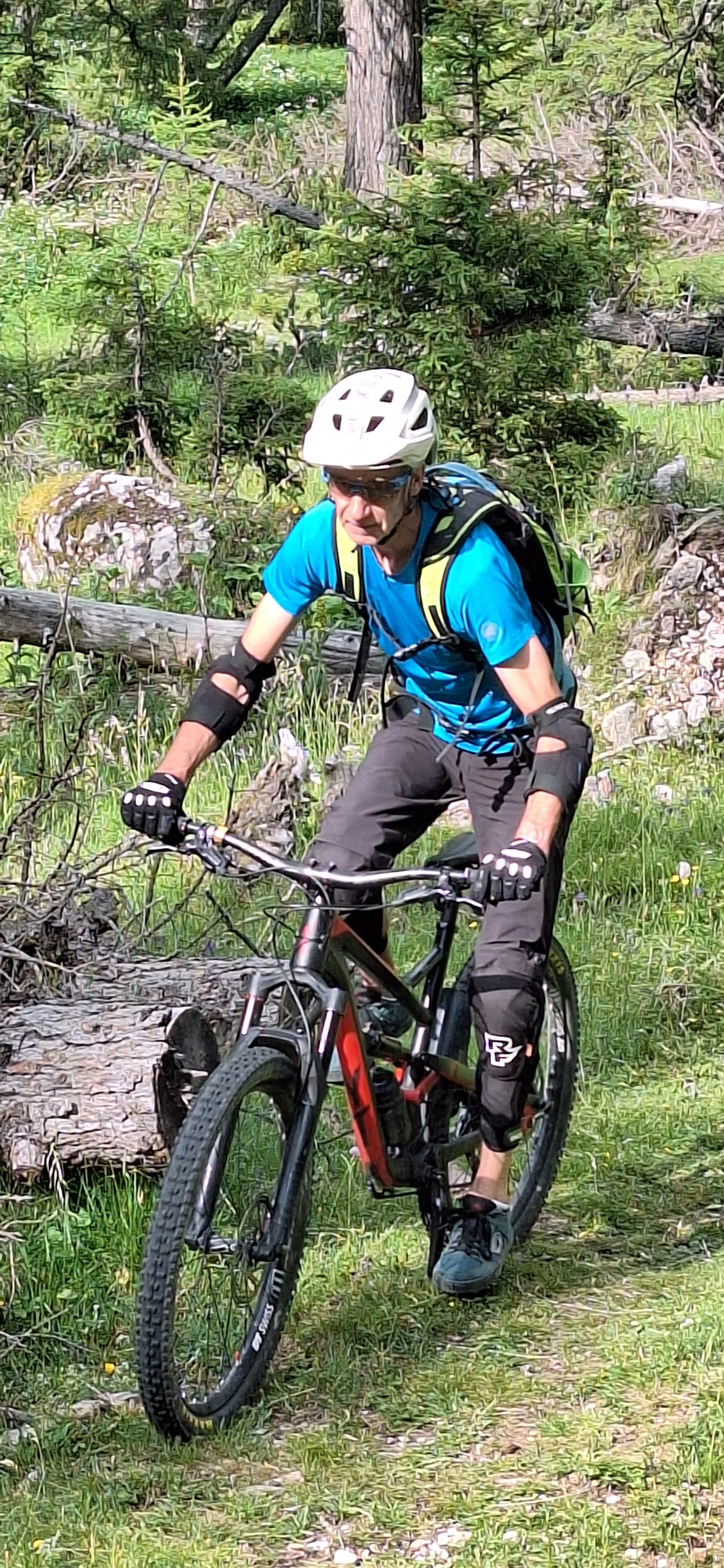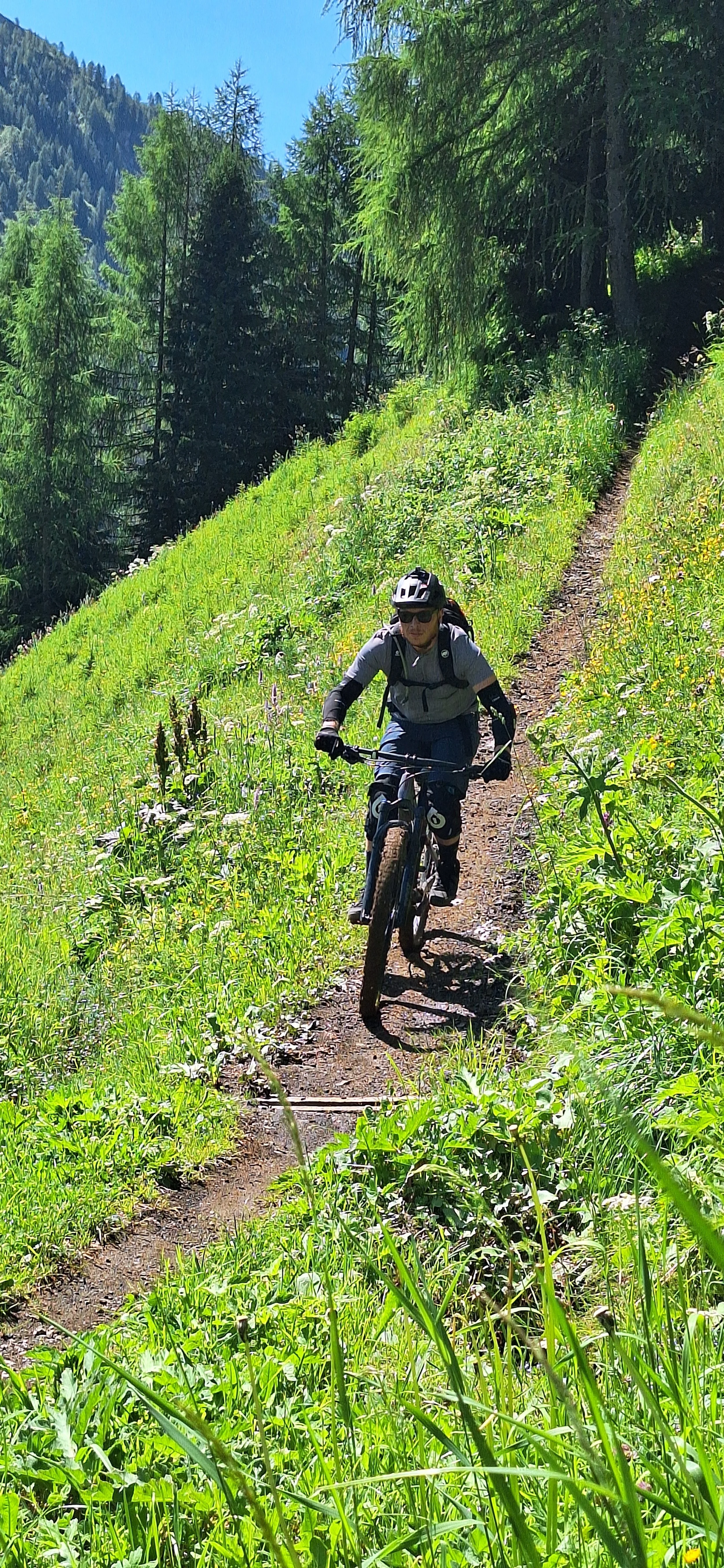 Oben angekommen bot sich ein schöner Blick auf das Gletschergebiet, allerdings zogen bereits erste dunkle Wolken auf. Die Abfahrt führte über einen teilweise verblockten und steilen Trail mit einigen Geröllpassagen. Wir mussten zügig fahren, um dem aufziehenden Gewitter zuvorzukommen, was uns fast gelungen ist. Kurz vor Ende der Abfahrt erwischte uns dann doch ein kurzer Schauer und wir kamen leicht durchnässt im Hotel an.