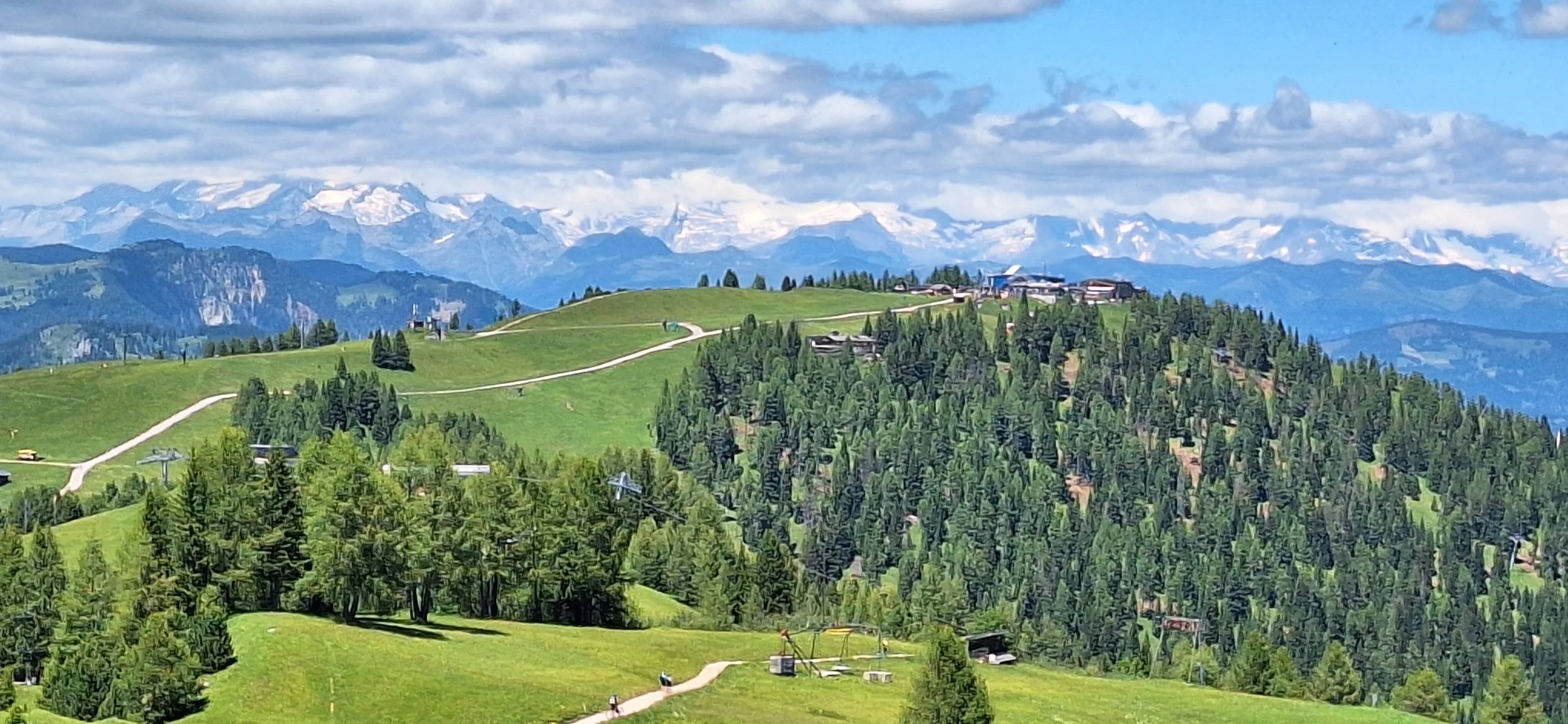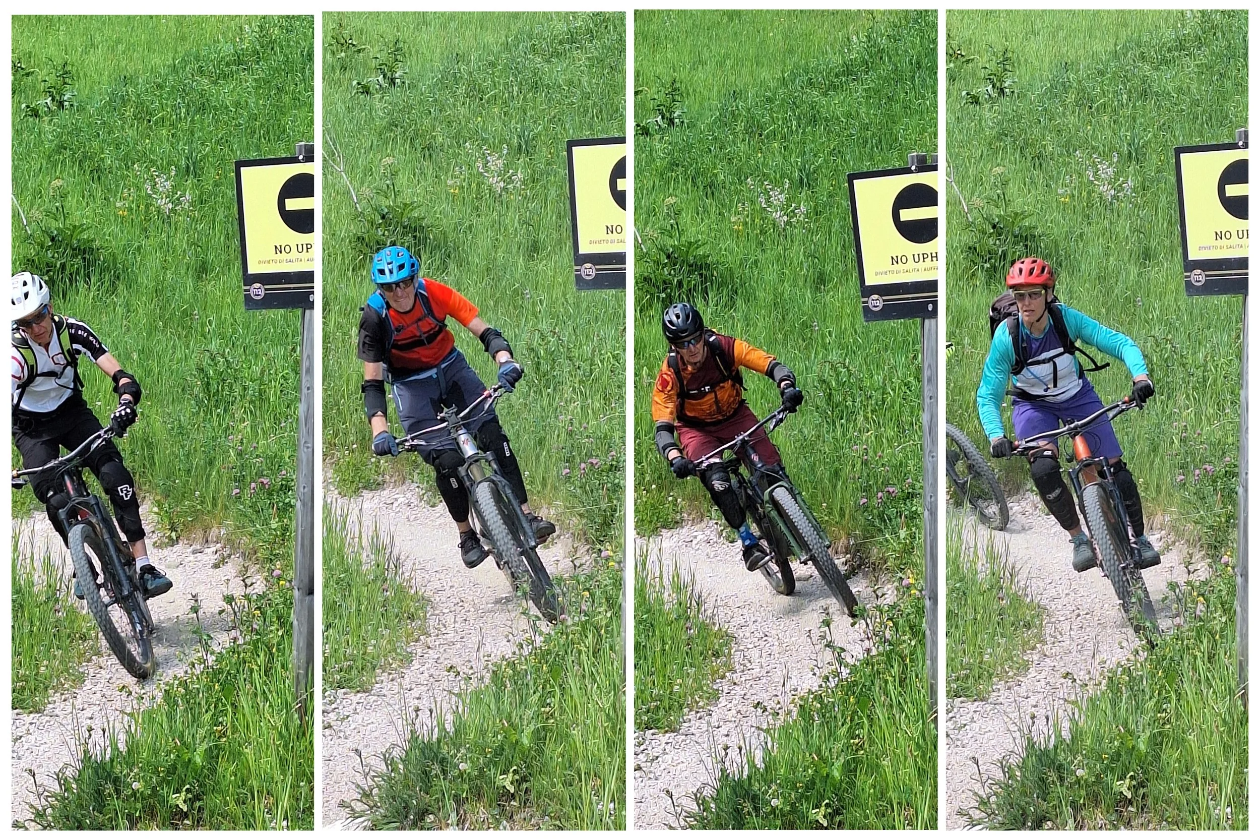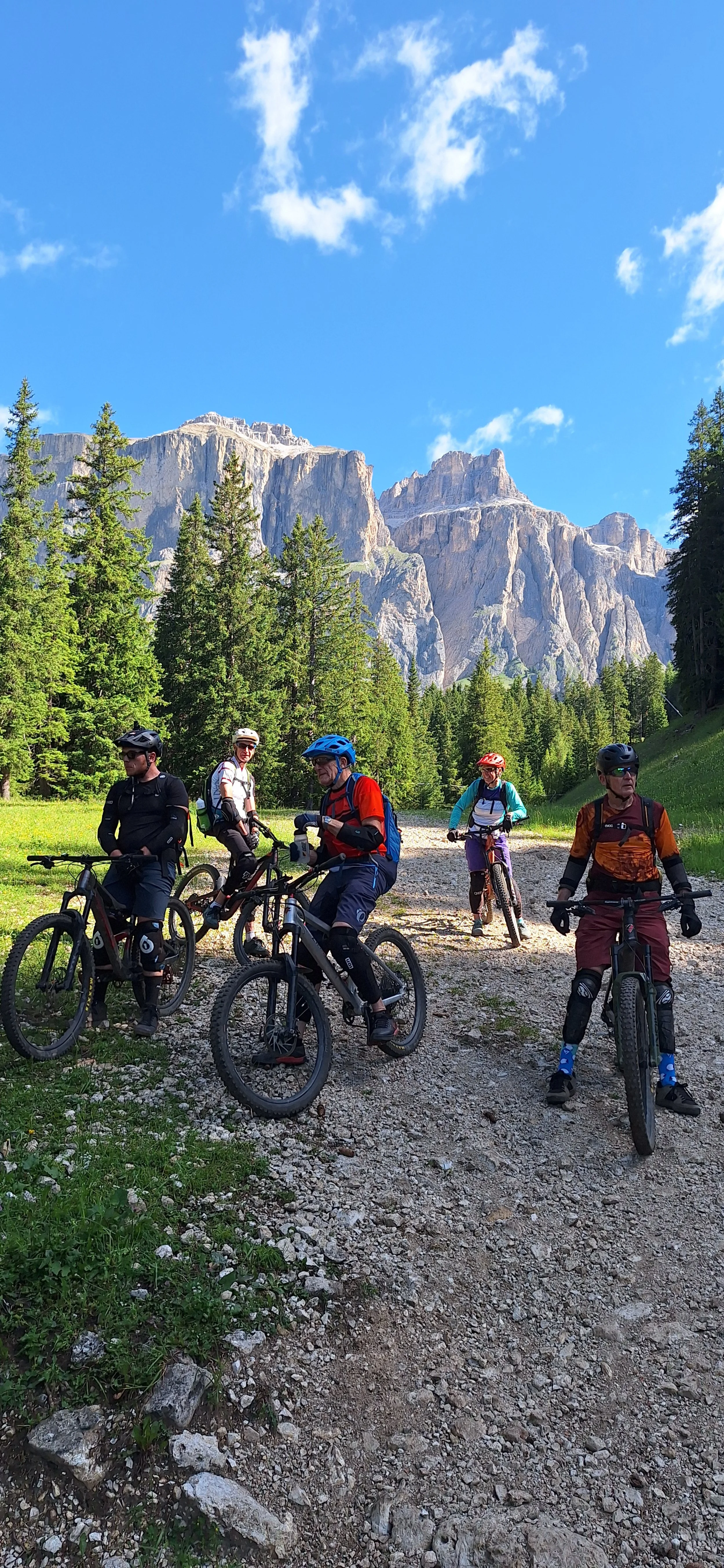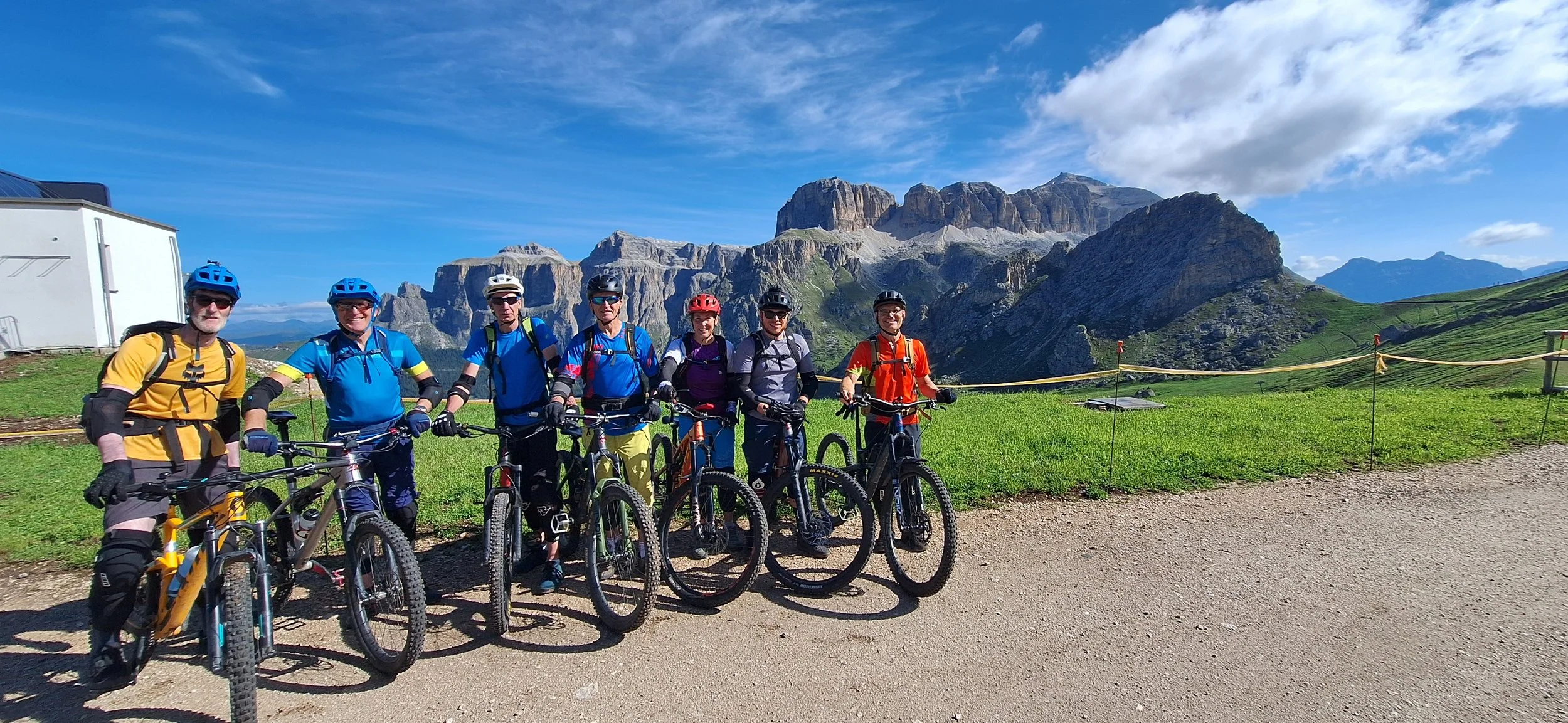 Noch einmal ging es mit dem Lift von Canazei hinauf auf rund 2400 Meter in die Dolomiten. Die klare Sicht auf die umliegenden Gipfel war ein schöner Abschluss. Zwar standen an diesem Tag keine nennenswerten Höhenmeter mehr an, dafür fuhren wir noch einige schöne, technisch anspruchsvolle Naturtrails bergab, die fahrerisch nochmals forderten, aber auch richtig Spaß machten.