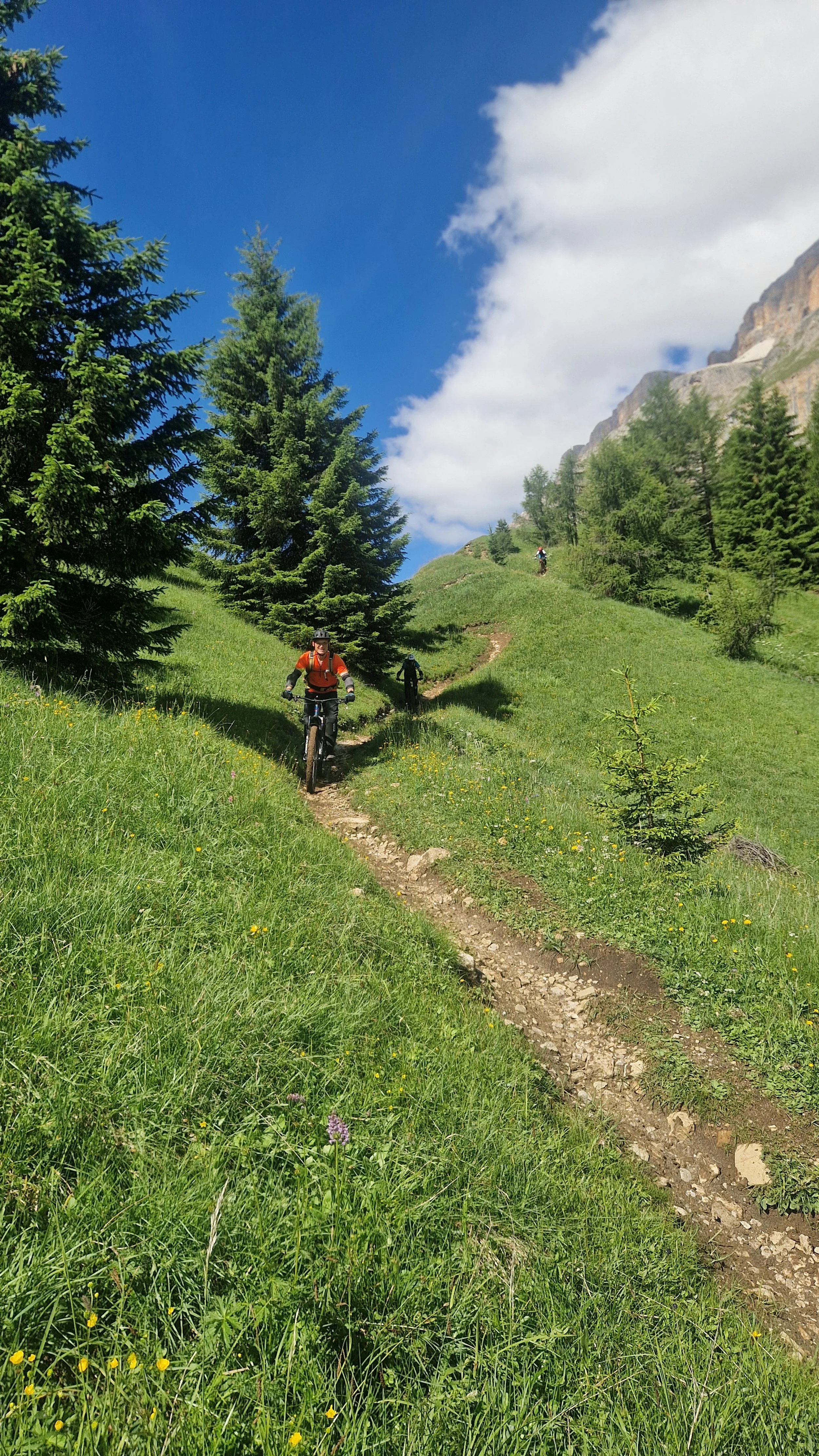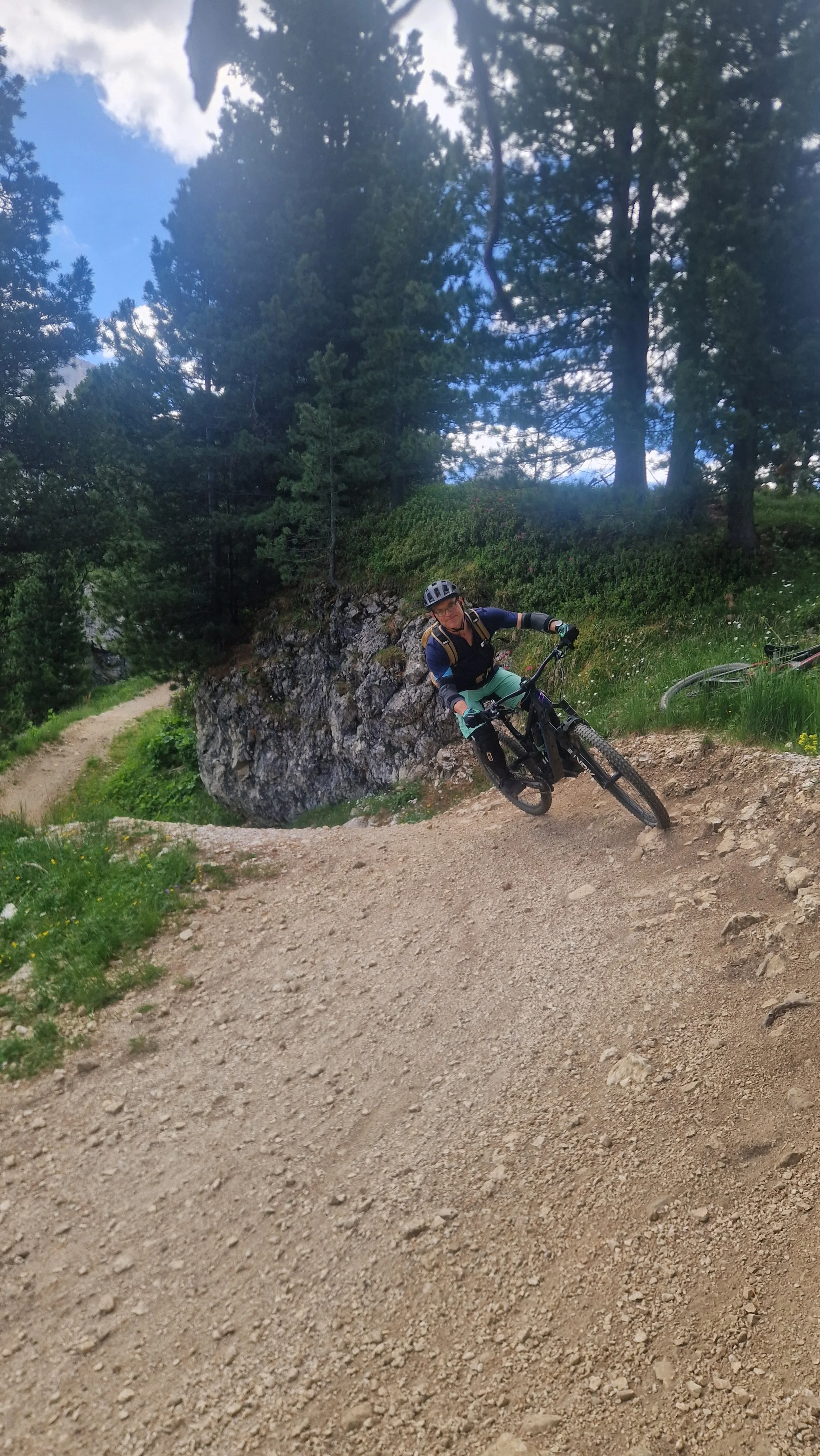 Die landschaftliche Kulisse rund um die Dolomiten war durchweg beeindruckend. Schroffe Felsformationen, grüne Almwiesen und immer wieder weite Ausblicke auf die umliegenden Berge begleiteten uns den ganzen Tag über. Die Trails reichten je nach Abschnitt von S1 bis S3. Flüssig, gut angelegt und an vielen Stellen mit richtig viel Fahrspaß. Besonders in den technischen Passagen zeigte sich, dass die Region nicht nur landschaftlich, sondern auch fahrerisch einiges zu bieten hat.