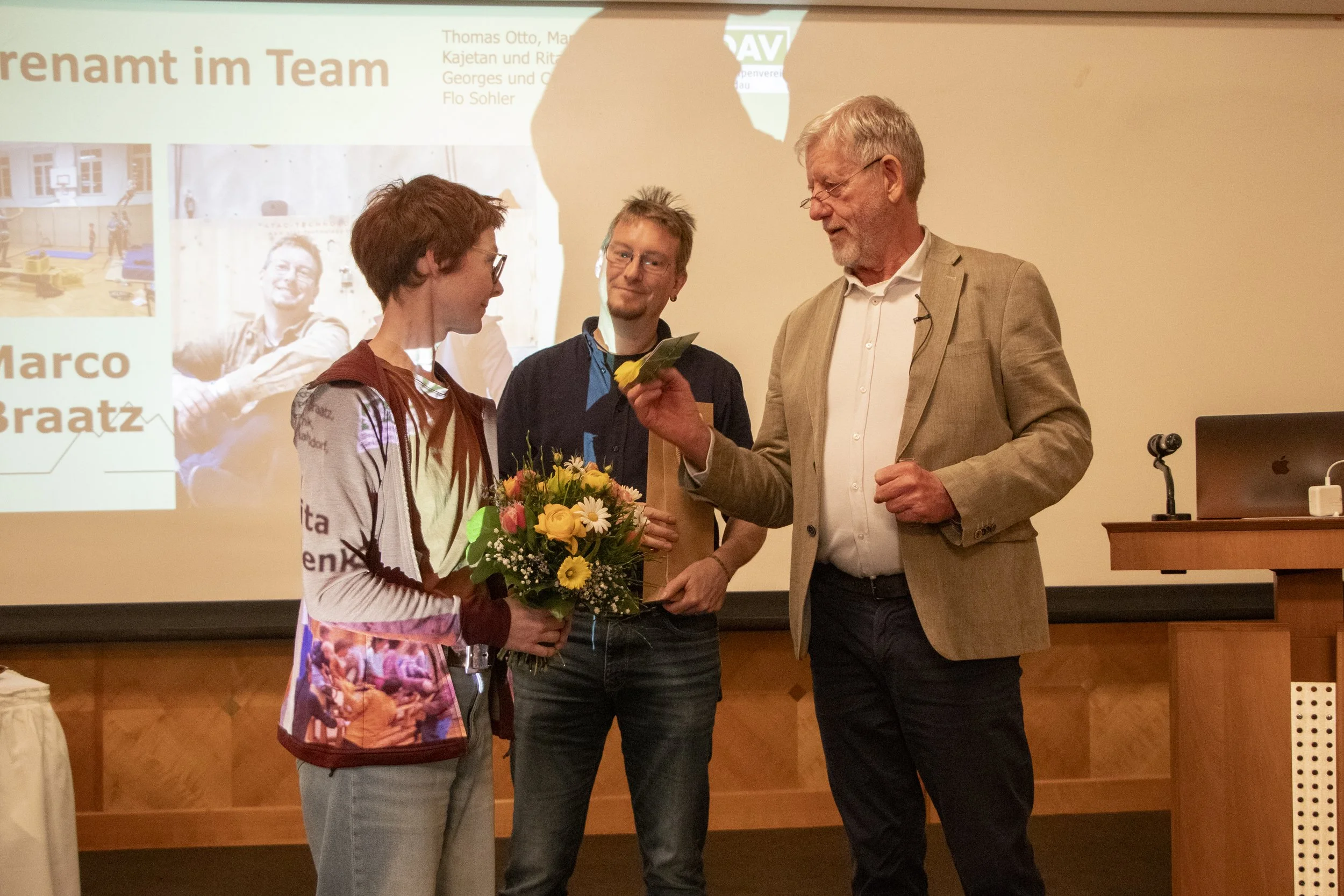 Stellvertretend für das vielfältige Engagement wurde die Kinderklettergruppe geehrt. Rita Plenk, Marco Braatz (siehe Bild oben) und weitere Ehrenamtliche führen hier wöchentlich Kinder spielerisch an den Klettersport heran und leisten damit einen wichtigen Beitrag zur Nachwuchsförderung.